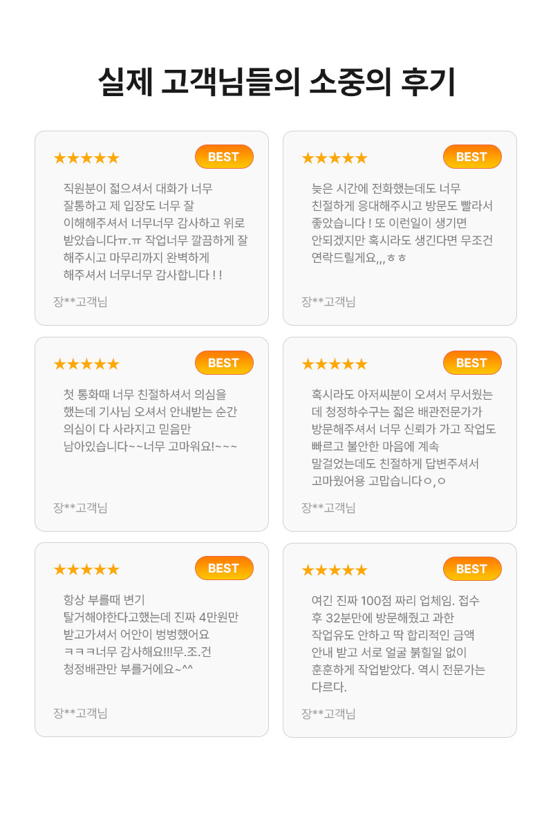 '청정배관'는 고객님의 개인정보를 중요시하며, "정보통신망 이용촉진 및 정보보호"에 관한 법률을 준수하고 있습니다. 회사는 개인정보취급방침을 통하여 고객님께서 제공하시는 개인정보가 어떠한 용도와 방식으로 이용되고 있으며, 개인정보보호를 위해 어떠한 조치가 취해지고 있는지 알려드립니다. 회사는 개인정보취급방침을 개정하는 경우 웹사이트 공지사항(또는 개별공지)을 통하여 공지할 것입니다. ο 본 방침은 : 2025 년 1월 1일 부터 시행됩니다. ■ 수집하는 개인정보 항목 회사는 상담, 서비스 신청 등등을 위해 아래와 같은 개인정보를 수집하고 있습니다. ο 수집항목 : 이름, 비밀번호, 비밀번호 질문과 답변, 휴대전화번호, 이메일, 서비스 이용기록, 접속 로그, 쿠키 ο 개인정보 수집방법 : 홈페이지() ■ 개인정보의 수집 및 이용목적 회사는 수집한 개인정보를 다음의 목적을 위해 활용합니다.. ο 서비스 제공에 관한 계약 이행 및 서비스 제공에 따른 요금정산 콘텐츠 제공 , 구매 및 요금 결제 , 물품배송 또는 청구지 등 발송 , 금융거래 본인 인증 및 금융 서비스 ο 회원 관리 회원제 서비스 이용에 따른 본인확인 , 개인 식별 , 가입 의사 확인 , 연령확인 , 만14세 미만 아동 개인정보 수집 시 법정 대리인 동의여부 확인 , 불만처리 등 민원처리 , 고지사항 전달 ο 마케팅 및 광고에 활용 신규 서비스(제품) 개발 및 특화 , 이벤트 등 광고성 정보 전달 ■ 개인정보의 보유 및 이용기간 원칙적으로, 개인정보 수집 및 이용목적이 달성된 후에는 해당 정보를 지체 없이 파기합니다. 단, 관계법령의 규정에 의하여 보존할 필요가 있는 경우 회사는 아래와 같이 관계법령에서 정한 일정한 기간 동안 회원정보를 보관합니다. - 보존 항목 : 로그인ID 보존 근거 : 전자상거래등에서의 소비자보호에 관한 법률 보존 기간 : 6개월 - 보존 항목 : 결제기록 보존 근거 : 전자상거래등에서의 소비자보호에 관한 법률 보존 기간 : 5년 ■ 개인정보의 파기절차 및 방법 회사는 원칙적으로 개인정보 수집 및 이용목적이 달성된 후에는 해당 정보를 지체없이 파기합니다. 파기절차 및 방법은 다음과 같습니다. ο 파기절차 회원님이 회원가입 등을 위해 입력하신 정보는 목적이 달성된 후 별도의 DB로 옮겨져(종이의 경우 별도의 서류함) 내부 방침 및 기타 관련 법령에 의한 정보보호 사유에 따라(보유 및 이용기간 참조) 일정 기간 저장된 후 파기되어집니다. 별도 DB로 옮겨진 개인정보는 법률에 의한 경우가 아니고서는 보유되어지는 이외의 다른 목적으로 이용되지 않습니다. ο 파기방법 - 종이에 출력된 개인정보는 분쇄기로 분쇄하거나 소각을 통하여 파기합니다. ■ 개인정보 제공 회사는 이용자의 개인정보를 원칙적으로 외부에 제공하지 않습니다. 다만, 아래의 경우에는 예외로 합니다. - 이용자들이 사전에 동의한 경우 - 법령의 규정에 의거하거나, 수사 목적으로 법령에 정해진 절차와 방법에 따라 수사기관의 요구가 있는 경우 ■ 수집한 개인정보의 위탁 회사는 고객님의 동의없이 고객님의 정보를 외부 업체에 위탁하지 않습니다. 향후 그러한 필요가 생길 경우, 위탁 대상자와 위탁 업무 내용에 대해 고객님에게 통지하고 필요한 경우 사전 동의를 받도록 하겠습니다. ■ 이용자 및 법정대리인의 권리와 그 행사방법 이용자 및 법정 대리인은 언제든지 등록되어 있는 자신 혹은 당해 만 14세 미만 아동의 개인정보를 조회하거나 수정할 수 있으며 가입해지를 요청할 수도 있습니다. 이용자 혹은 만 14세 미만 아동의 개인정보 조회, 수정을 위해서는 ‘개인정보변경’(또는 ‘회원정보수정’ 등)을 가입해지(동의철회)를 위해서는 “회원탈퇴”를 클릭하여 본인 확인 절차를 거치신 후 직접 열람, 정정 또는 탈퇴가 가능합니다. 혹은 개인정보관리책임자에게 서면, 전화 또는 이메일로 연락하시면 지체없이 조치하겠습니다. 귀하가 개인정보의 오류에 대한 정정을 요청하신 경우에는 정정을 완료하기 전까지 당해 개인정보를 이용 또는 제공하지 않습니다. 또한 잘못된 개인정보를 제3자에게 이미 제공한 경우에는 정정 처리결과를 제3자에게 지체없이 통지하여 정정이 이루어지도록 하겠습니다. 회사는 이용자 혹은 법정 대리인의 요청에 의해 해지 또는 삭제된 개인정보는 회사가 수집하는 개인정보의 보유 및 이용기간”에 명시된 바에 따라 처리하고 그 외의 용도로 열람 또는 이용할 수 없도록 처리하고 있습니다. ■ 개인정보 자동수집 장치의 설치, 운영 및 그 거부에 관한 사항 회사는 귀하의 정보를 수시로 저장하고 찾아내는 ‘쿠키(cookie)’ 등을 운용합니다. 쿠키란 "청정배관"의 웹사이트를 운영하는데 이용되는 서버가 귀하의 브라우저에 보내는 아주 작은 텍스트 파일로서 귀하의 컴퓨터 하드디스크에 저장됩니다. 회사은(는) 다음과 같은 목적을 위해 쿠키를 사용합니다. ▶ 쿠키 등 사용 목적 - 회원과 비회원의 접속 빈도나 방문 시간 등을 분석, 이용자의 취향과 관심분야를 파악 및 자취 추적, 각종 이벤트 참여 정도 및 방문 회수 파악 등을 통한 타겟 마케팅 및 개인 맞춤 서비스 제공 귀하는 쿠키 설치