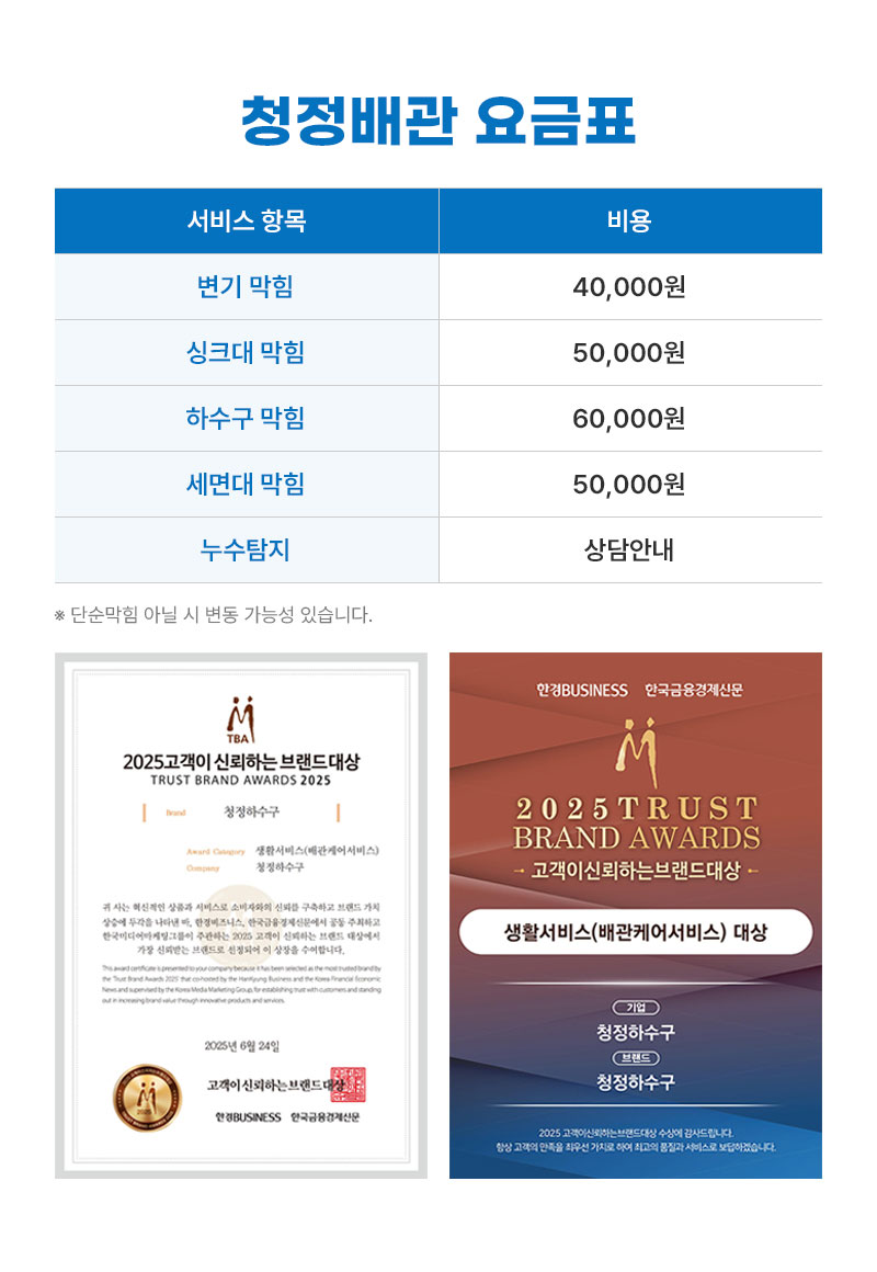 '청정배관'는 고객님의 개인정보를 중요시하며, "정보통신망 이용촉진 및 정보보호"에 관한 법률을 준수하고 있습니다. 회사는 개인정보취급방침을 통하여 고객님께서 제공하시는 개인정보가 어떠한 용도와 방식으로 이용되고 있으며, 개인정보보호를 위해 어떠한 조치가 취해지고 있는지 알려드립니다. 회사는 개인정보취급방침을 개정하는 경우 웹사이트 공지사항(또는 개별공지)을 통하여 공지할 것입니다. ο 본 방침은 : 2025 년 1월 1일 부터 시행됩니다. ■ 수집하는 개인정보 항목 회사는 상담, 서비스 신청 등등을 위해 아래와 같은 개인정보를 수집하고 있습니다. ο 수집항목 : 이름, 비밀번호, 비밀번호 질문과 답변, 휴대전화번호, 이메일, 서비스 이용기록, 접속 로그, 쿠키 ο 개인정보 수집방법 : 홈페이지() ■ 개인정보의 수집 및 이용목적 회사는 수집한 개인정보를 다음의 목적을 위해 활용합니다.. ο 서비스 제공에 관한 계약 이행 및 서비스 제공에 따른 요금정산 콘텐츠 제공 , 구매 및 요금 결제 , 물품배송 또는 청구지 등 발송 , 금융거래 본인 인증 및 금융 서비스 ο 회원 관리 회원제 서비스 이용에 따른 본인확인 , 개인 식별 , 가입 의사 확인 , 연령확인 , 만14세 미만 아동 개인정보 수집 시 법정 대리인 동의여부 확인 , 불만처리 등 민원처리 , 고지사항 전달 ο 마케팅 및 광고에 활용 신규 서비스(제품) 개발 및 특화 , 이벤트 등 광고성 정보 전달 ■ 개인정보의 보유 및 이용기간 원칙적으로, 개인정보 수집 및 이용목적이 달성된 후에는 해당 정보를 지체 없이 파기합니다. 단, 관계법령의 규정에 의하여 보존할 필요가 있는 경우 회사는 아래와 같이 관계법령에서 정한 일정한 기간 동안 회원정보를 보관합니다. - 보존 항목 : 로그인ID 보존 근거 : 전자상거래등에서의 소비자보호에 관한 법률 보존 기간 : 6개월 - 보존 항목 : 결제기록 보존 근거 : 전자상거래등에서의 소비자보호에 관한 법률 보존 기간 : 5년 ■ 개인정보의 파기절차 및 방법 회사는 원칙적으로 개인정보 수집 및 이용목적이 달성된 후에는 해당 정보를 지체없이 파기합니다. 파기절차 및 방법은 다음과 같습니다. ο 파기절차 회원님이 회원가입 등을 위해 입력하신 정보는 목적이 달성된 후 별도의 DB로 옮겨져(종이의 경우 별도의 서류함) 내부 방침 및 기타 관련 법령에 의한 정보보호 사유에 따라(보유 및 이용기간 참조) 일정 기간 저장된 후 파기되어집니다. 별도 DB로 옮겨진 개인정보는 법률에 의한 경우가 아니고서는 보유되어지는 이외의 다른 목적으로 이용되지 않습니다. ο 파기방법 - 종이에 출력된 개인정보는 분쇄기로 분쇄하거나 소각을 통하여 파기합니다. ■ 개인정보 제공 회사는 이용자의 개인정보를 원칙적으로 외부에 제공하지 않습니다. 다만, 아래의 경우에는 예외로 합니다. - 이용자들이 사전에 동의한 경우 - 법령의 규정에 의거하거나, 수사 목적으로 법령에 정해진 절차와 방법에 따라 수사기관의 요구가 있는 경우 ■ 수집한 개인정보의 위탁 회사는 고객님의 동의없이 고객님의 정보를 외부 업체에 위탁하지 않습니다. 향후 그러한 필요가 생길 경우, 위탁 대상자와 위탁 업무 내용에 대해 고객님에게 통지하고 필요한 경우 사전 동의를 받도록 하겠습니다. ■ 이용자 및 법정대리인의 권리와 그 행사방법 이용자 및 법정 대리인은 언제든지 등록되어 있는 자신 혹은 당해 만 14세 미만 아동의 개인정보를 조회하거나 수정할 수 있으며 가입해지를 요청할 수도 있습니다. 이용자 혹은 만 14세 미만 아동의 개인정보 조회, 수정을 위해서는 ‘개인정보변경’(또는 ‘회원정보수정’ 등)을 가입해지(동의철회)를 위해서는 “회원탈퇴”를 클릭하여 본인 확인 절차를 거치신 후 직접 열람, 정정 또는 탈퇴가 가능합니다. 혹은 개인정보관리책임자에게 서면, 전화 또는 이메일로 연락하시면 지체없이 조치하겠습니다. 귀하가 개인정보의 오류에 대한 정정을 요청하신 경우에는 정정을 완료하기 전까지 당해 개인정보를 이용 또는 제공하지 않습니다. 또한 잘못된 개인정보를 제3자에게 이미 제공한 경우에는 정정 처리결과를 제3자에게 지체없이 통지하여 정정이 이루어지도록 하겠습니다. 회사는 이용자 혹은 법정 대리인의 요청에 의해 해지 또는 삭제된 개인정보는 회사가 수집하는 개인정보의 보유 및 이용기간”에 명시된 바에 따라 처리하고 그 외의 용도로 열람 또는 이용할 수 없도록 처리하고 있습니다. ■ 개인정보 자동수집 장치의 설치, 운영 및 그 거부에 관한 사항 회사는 귀하의 정보를 수시로 저장하고 찾아내는 ‘쿠키(cookie)’ 등을 운용합니다. 쿠키란 "청정배관"의 웹사이트를 운영하는데 이용되는 서버가 귀하의 브라우저에 보내는 아주 작은 텍스트 파일로서 귀하의 컴퓨터 하드디스크에 저장됩니다. 회사은(는) 다음과 같은 목적을 위해 쿠키를 사용합니다. ▶ 쿠키 등 사용 목적 - 회원과 비회원의 접속 빈도나 방문 시간 등을 분석, 이용자의 취향과 관심분야를 파악 및 자취 추적, 각종 이벤트 참여 정도 및 방문 회수 파악 등을 통한 타겟 마케팅 및 개인 맞춤 서비스 제공 귀하는 쿠키 설치